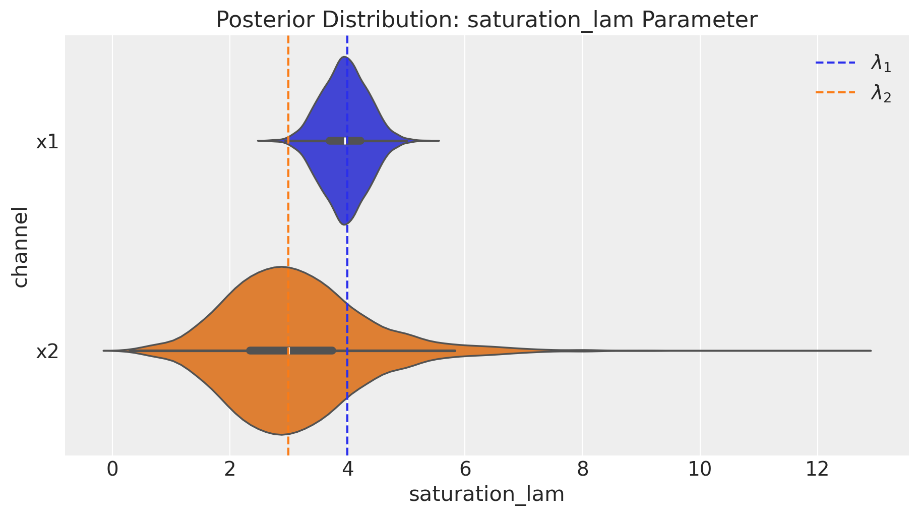 Remark: By design, \(x_{1}\) should resemble a typical paid social channel and \(x_{2}\) a offline (e.g. TV) spend time series.