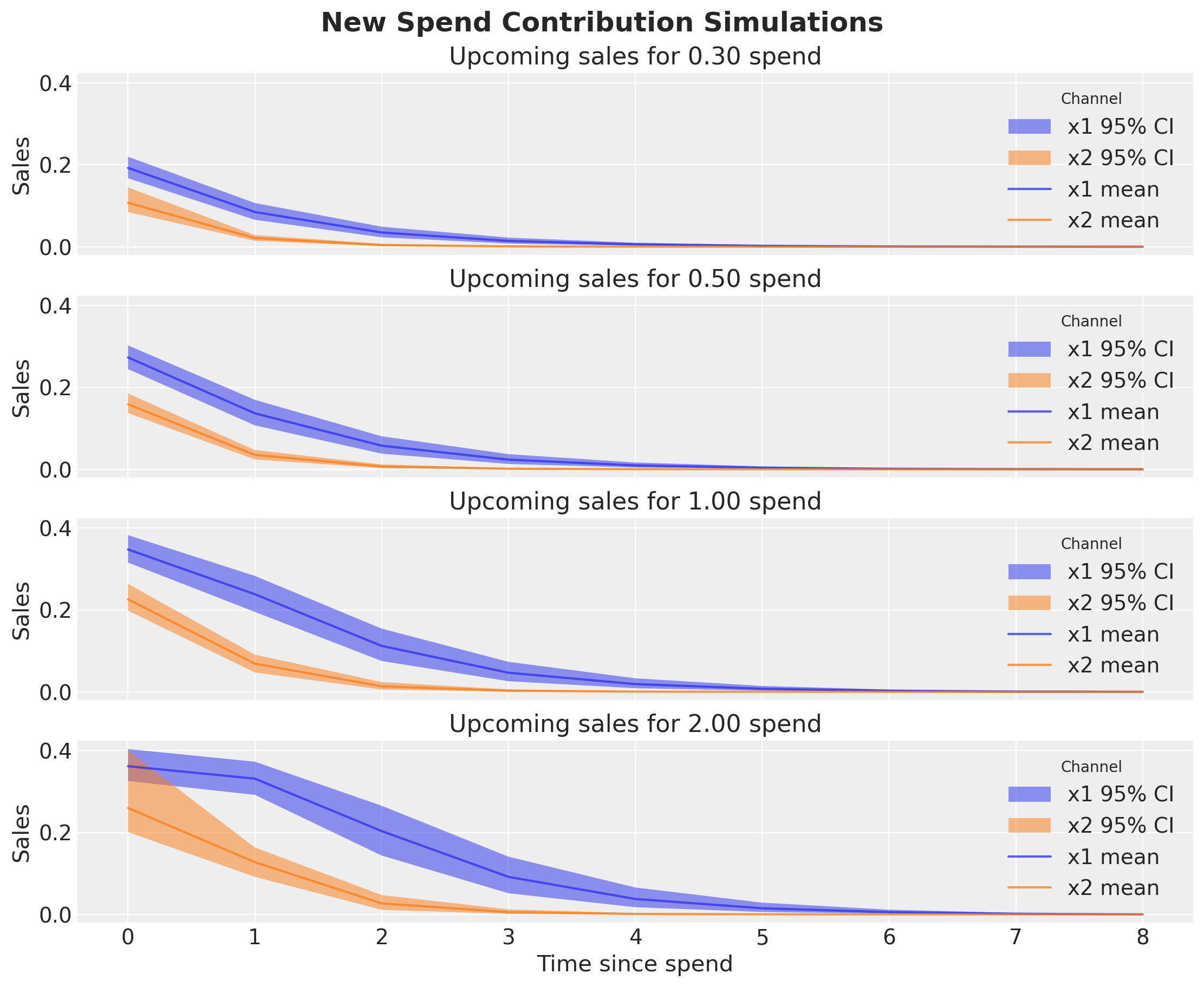 Finally we can use the model to understand the expected sales for different media spend scenarios considering the adstock and saturation effects learned from the data.