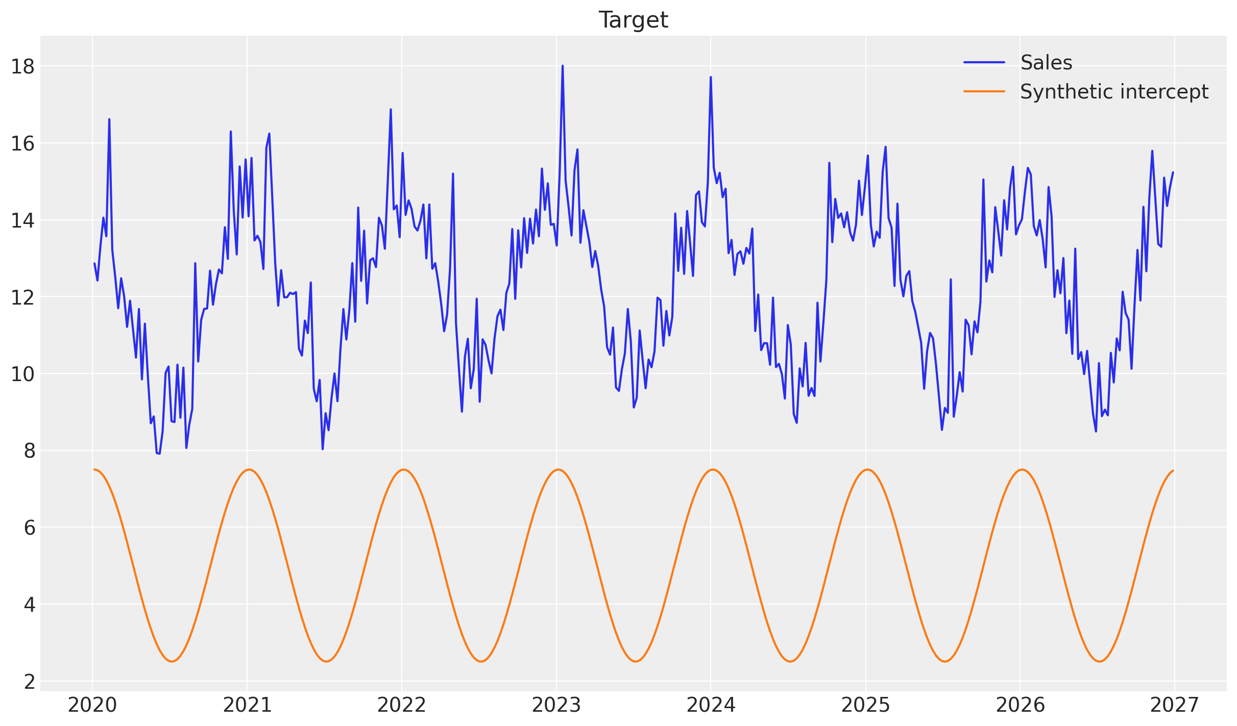 A common pattern in consumer goods sales is that sales are higher in the summer and lower in the winter, or reverse. In this example, we will simulate sales that follow this pattern—by letting the synthetic intercept be a cosine wave—and then see if the model can recover this using a time-varying intercept.